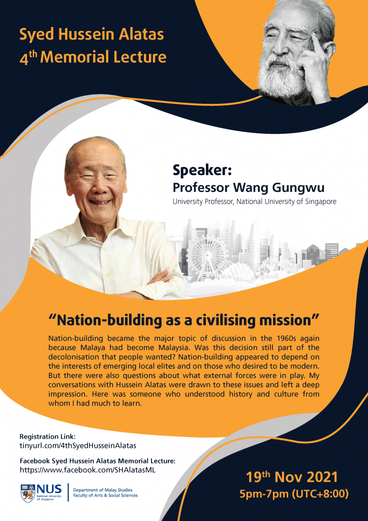 The Department of Malay Studies is pleased to invite you to the 4th Syed Hussein Alatas Memorial Lecture that will be held online via ZOOM on Friday 19 November 2021.