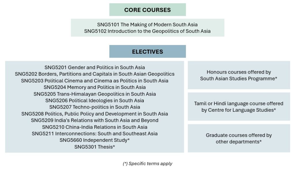 The Master’s programme is led by the South Asian Studies Programme, in collaboration with the Institute of South Asian Studies (ISAS) renowned for their research depth and interdisciplinary teaching. Students will have access to top-tier faculty and thought leaders in the field within a globally ranked university. The opportunity to learn South Asian languages (Tamil/Hindi)— would be an added advantage for non-native speakers seeking deeper regional engagement.