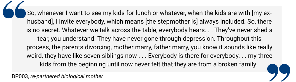 Conversely, when co-parenting relationships between biological parents and step-parents were cooperative and respectful, the children experienced better adjustment. One biological mother described how inclusive co-parenting contributed to her children’s well-being: