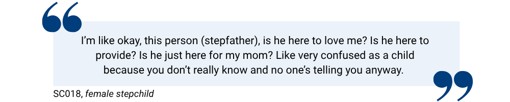 This experience of role ambiguity echoes Braithwaite and Baxter (2006), who noted that children often lack clear information about how their step-parent came into the family, which can make the transition confusing.