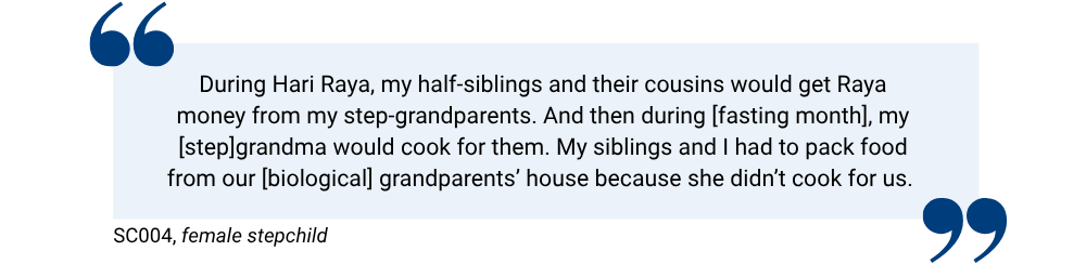 Aside from the adult dynamics that emerged from within the home, we found that stepchildren’s experiences were shaped not only by relationships within the household, but also by the ways adult actors outside the home — in society and institutions — acknowledge, affirm, or stigmatise step-families. These broader adult dynamics, though more indirect, still significantly affected how stepchildren perceive their family’s legitimacy and their place within it.