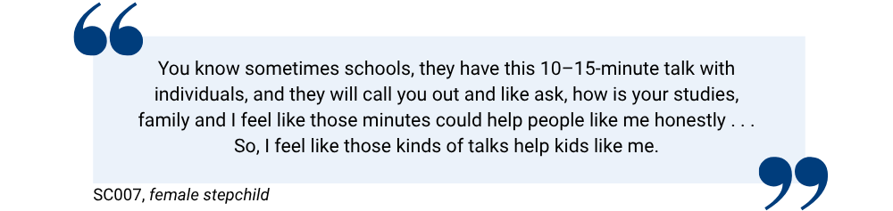 These findings also point to the role of institutions, such as schools, in mediating step-family experiences. While not always visible in daily family life, these institutions often serve as the only external environment where stepchildren’s needs might be noticed and addressed. While some supportive encounters were noted, many participants reported a lack of support and understanding in schools.