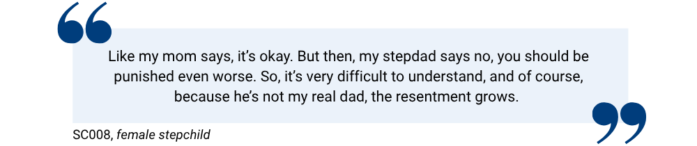 This ambiguity was especially unsettling when it intersected with conflict in parenting styles between the re-partnered parent and the step-parent. When the parental figures were not aligned, stepchildren were caught in inconsistent systems of rules and discipline that can feel unfair or harsh, causing further confusion and even resentment towards the step-parents:
