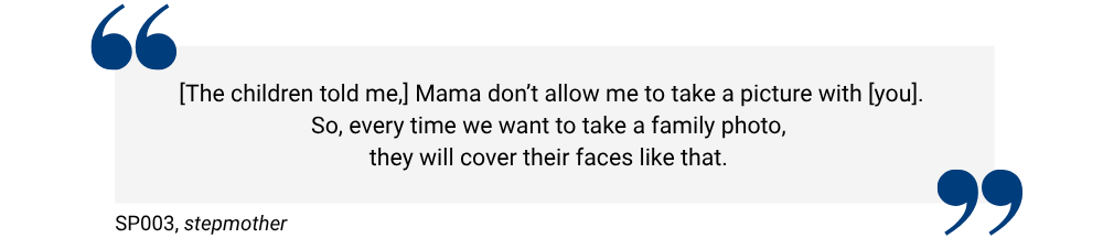 In some cases, the biological parent who is not part of the new household (often the ex-spouse of the re-partnered parent) acted as a gatekeeper, controlling or limiting the step-parent’s involvement with the children. This restrictive gatekeeping manifested in subtle ways, such as discouraging children from acknowledging the step-parent’s role or participating in family activities together. One stepmother shared how her stepchildren were discouraged from openly acknowledging her, recalling: