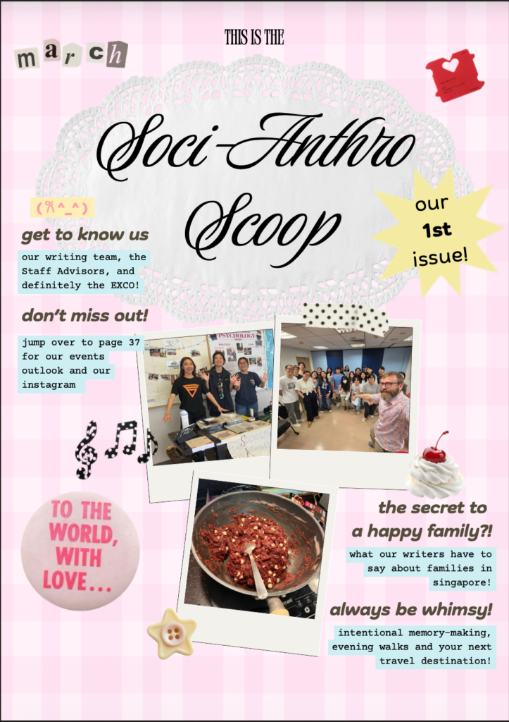 Formed in 1967 by a group of enthusiastic and idealistic freshmen, the NUS Sociology Society has long been part of the student life of the Department of Sociology. Over the decades, the Society has evolved alongside the discipline itself. Today, as the NUS Sociology and Anthropology Society, we continue this legacy by bringing together students across both disciplines, recognising their shared commitment to understanding the complexities of human societies and cultures.